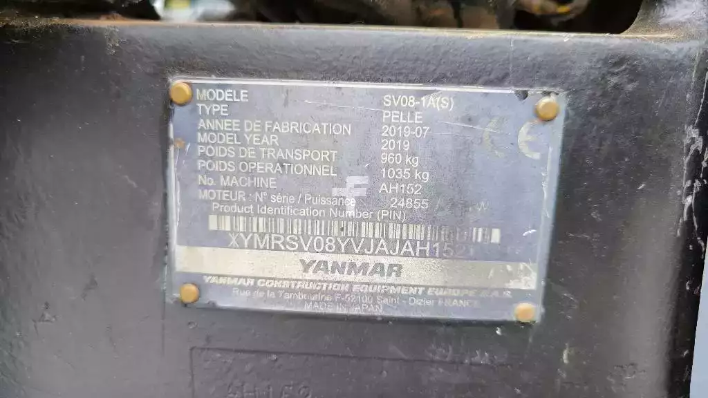 YANMAR SV 08 – 1A(S) Minibagger Baujahr 2019 – (sn:AH152) Die Lockerheit des Arbeitsarms im Bagger wurde behoben 1659 Mth, Leistung 10 PS, YANMAR-Motor, Leergewicht 960 kg, ausfahrbare Ketten, zusätzliche Hydraulik, Grabenschaufel 800 mm