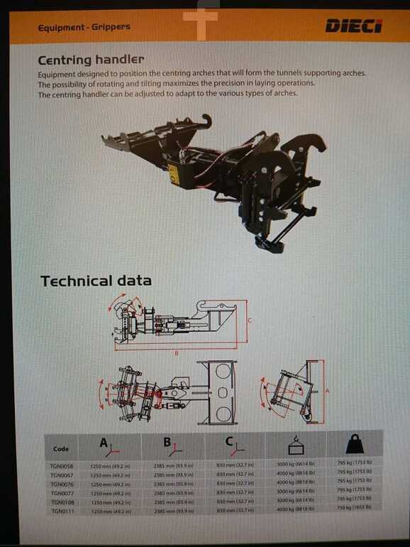 Clamp for concrete curbs and elements. Equipment designed to position the centering arches that will form the tunnel support arches. The possibility of rotating and tilting maximizes the precision in laying operations. The centering handler can be adjusted to adapt to the various types of arches.