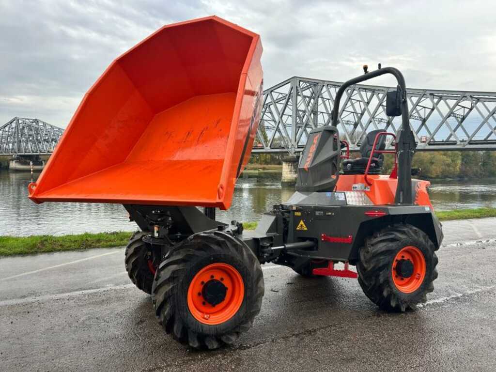 Déversement et rotation à 180° 4 roues motrices permanente Charge : 6000 Kg Eau : 1.665L A ras bord :2.455L En dôme : 3.154L Transmission hydrostatique à commande électronique Moteur : Deutz stage V 74.29 CV / 55.4 kW Arceau ROPS repliable vers l'arrière Assistant de démarrage en cote Frein négatif Caméra panoramique sue la benne Ecran numérique Différentiel autobloquant sur les deux essieux