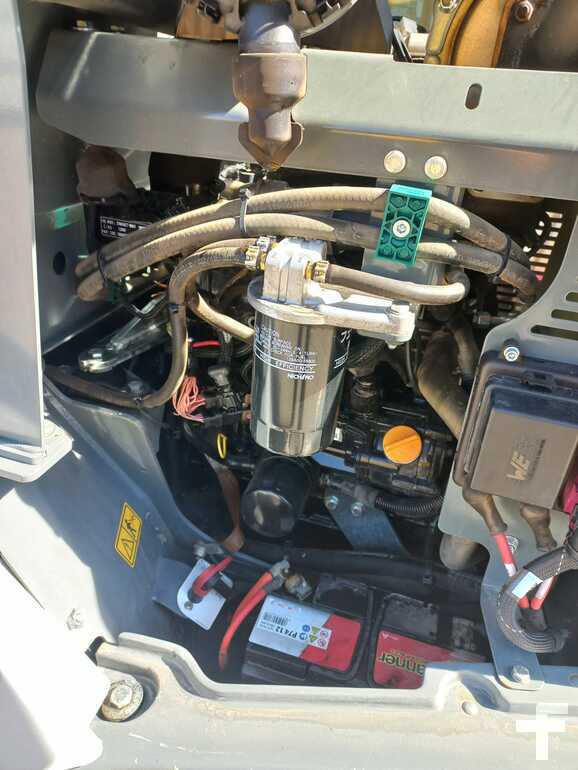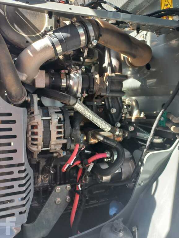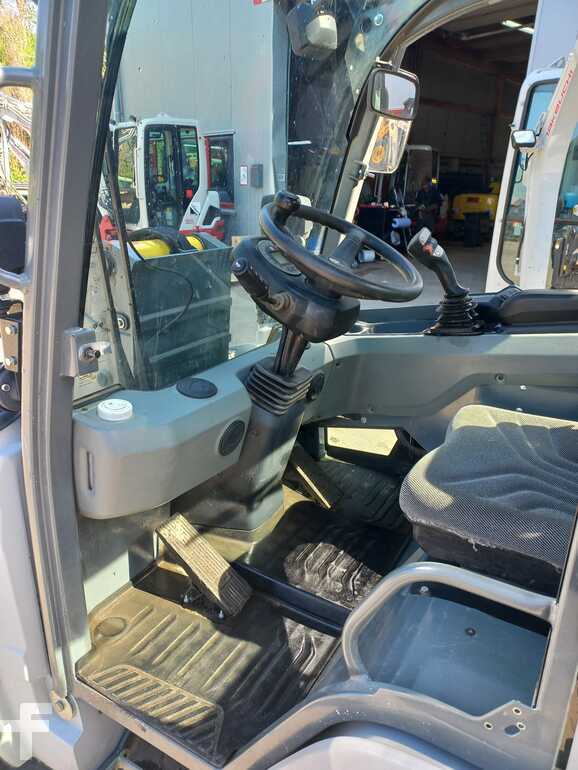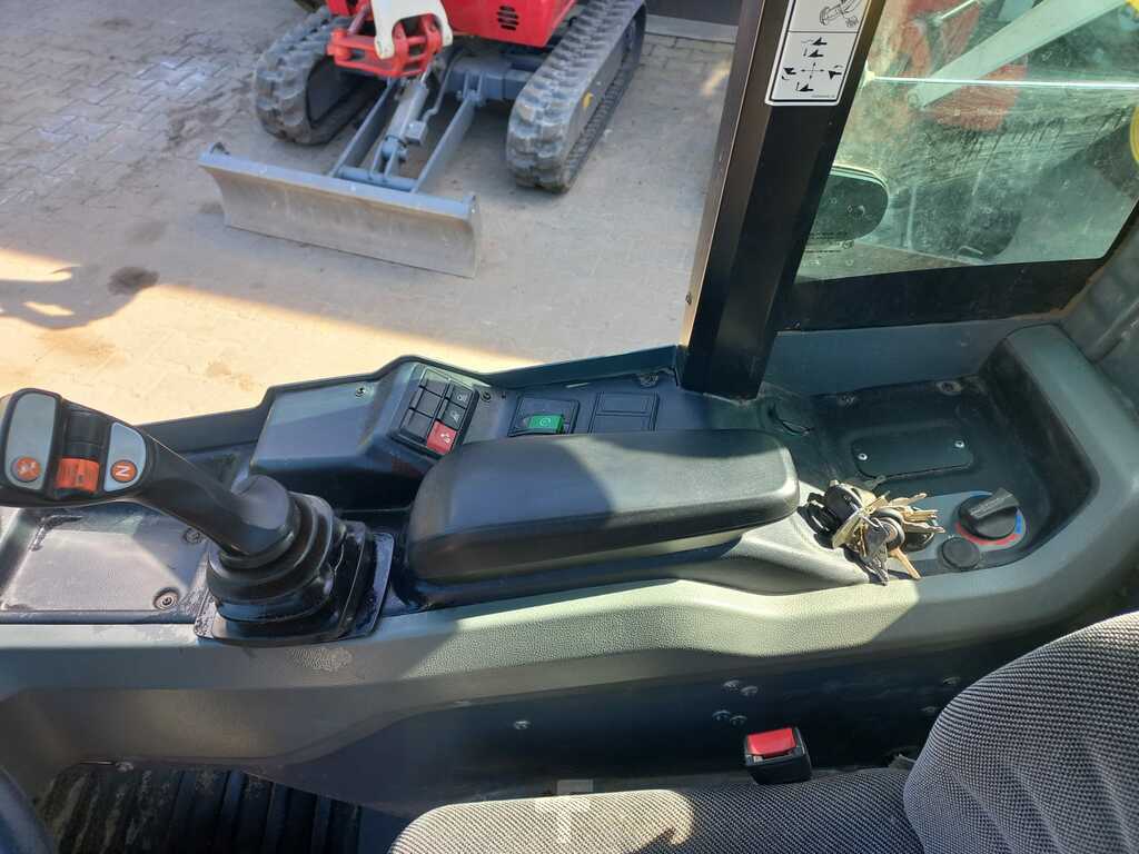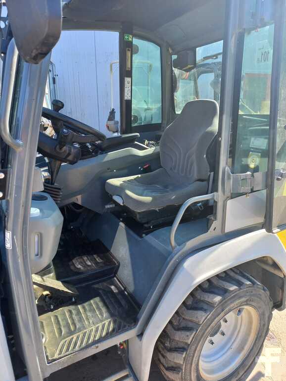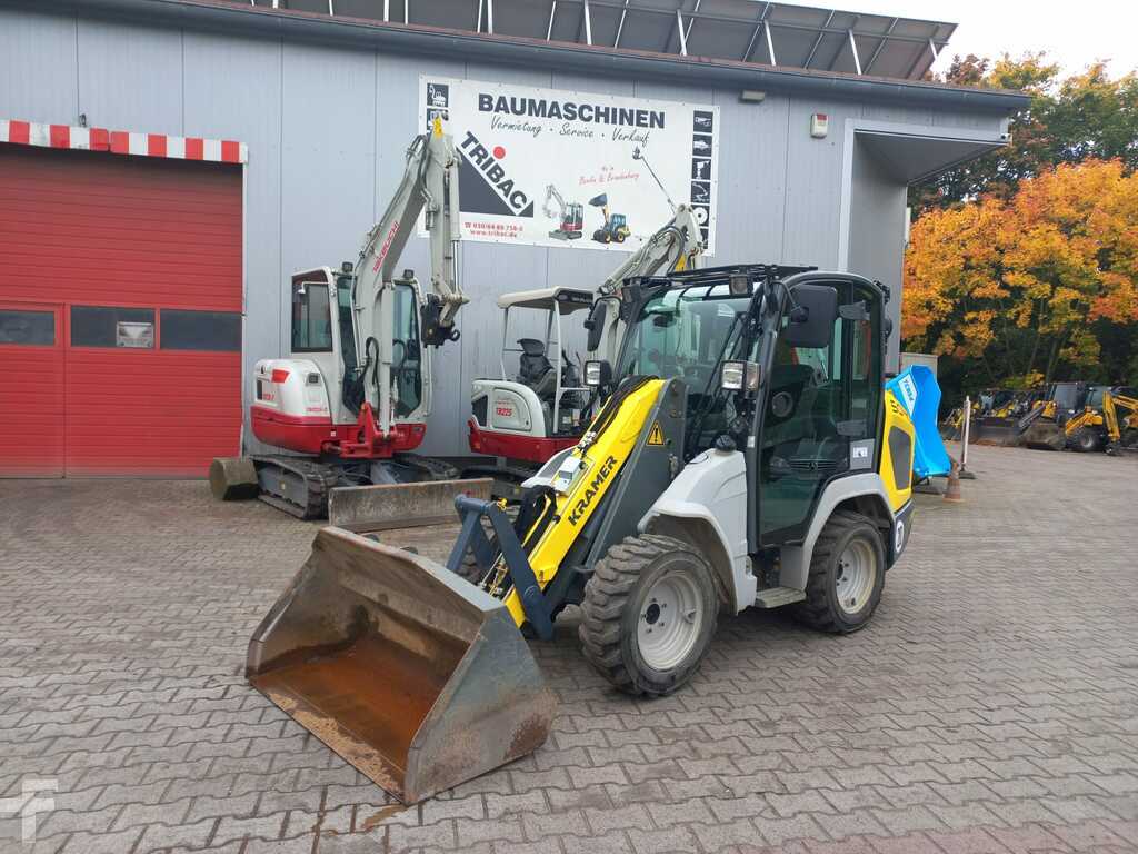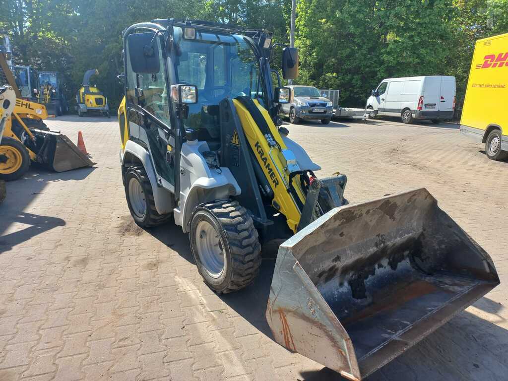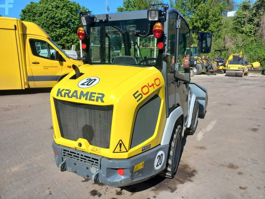 (Traducción de Mensaje): Kramerallrad 5040, 28.5 kw Yanmar Diesel Engine S5/T4F, con cabina baja y calefacción, 20 km/h, dirección de todas las ruedas, neumáticos 27x10.5-15 bkt SPHD ET0, luz de trabajo en la parte delantera y trasera, cortador de baterías, alivio de presión 3. Círculo de impuestos, paleta y paleta de 800 mm 800 mm