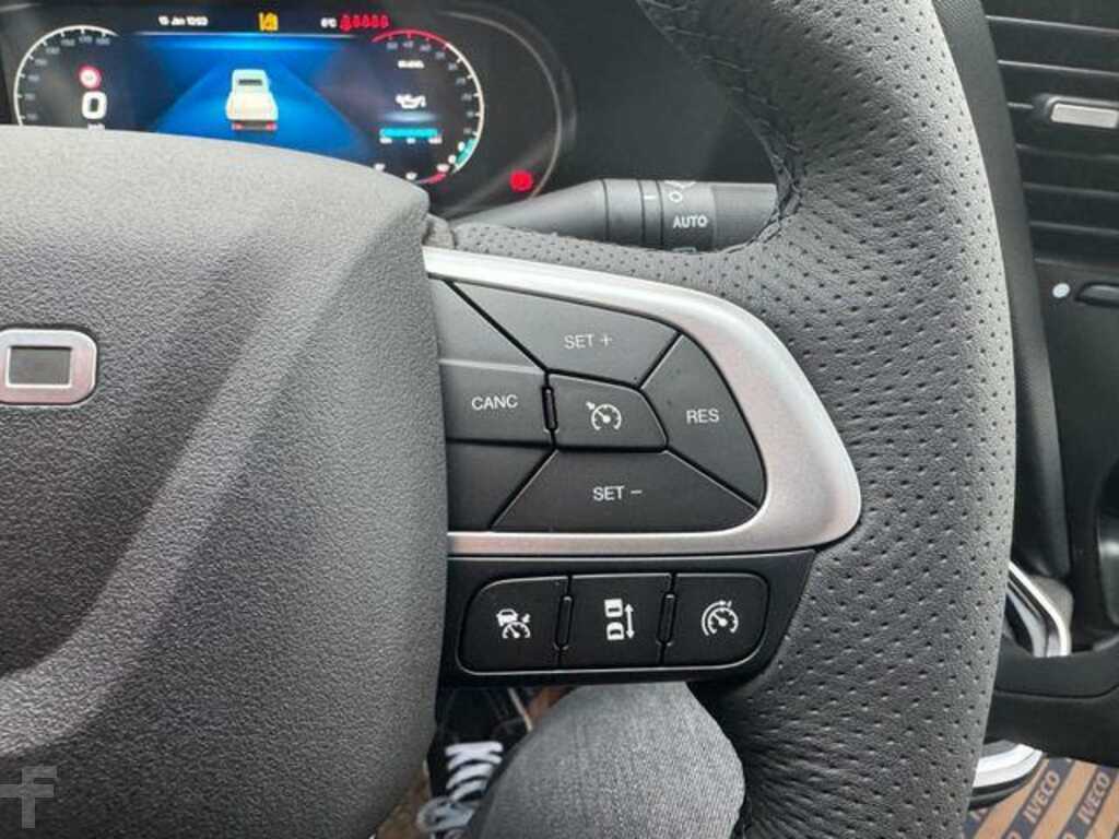 Motorización 3,0 l D EVIe 152kW (207PS), transmisión automática HI-MATIC de 8 velocidades, eje trasero con neumáticos gemelos, distancia entre ejes de 3450 mm, cinturones de seguridad con señal de advertencia para el conductor y el acompañante, reposacabezas estándar, tapizados de asientos de tela, banco de 4 plazas en el habitáculo, sensor de luz y lluvia, sensores de estacionamiento traseros, sistema de monitoreo de presión de neumáticos (TPMS), asistente de dirección proactivo con monitoreo de carril (ELK), asistente de frenada de emergencia AEBS con City Brake, retrovisores exteriores regulables eléctricamente y calefactables, sistema de aviso de somnolencia del conductor (DriverDrowsinessAttentionWarning), limitador de velocidad 160 km/h, reconocimiento de señales de tráfico con asistente de velocidad inteligente (ISA), elevalunas eléctricos para las puertas de entrada delanteras, airbags frontales para conductor y acompañante con pretensores de cinturón, depósito de AdBlue de 20 litros bajo la cabina del conductor, depósito de combustible de 63 l, relación del eje trasero i 3,29, aislamiento acústico confort, luces de contorno en la plataforma, material largo Portaequipajes delantero con protección de la cabina del conductor, asiento calefactable, asiento de lujo para el conductor con reposabrazos y soporte lumbar, regulable en altura, inclinación y dirección longitudinal, suspensión hidráulica, calefactable, asiento individual para el acompañante, multiajustable, faros Full LED, preparación para dispositivo de control EC digital 4.1, limitador de velocidad adicional, faros antiniebla, espejo para una anchura de carrocería de 2200 mm, pared trasera de la cabina con ventana, My Iveco Infotainment de 10 pulgadas, volante de cuero, toma USB para conductor y acompañante lateral, aire acondicionado con climatizador automático, control de crucero adaptativo (ACC), IC 194 blanco, neumáticos 195/75R16 y mucho más.