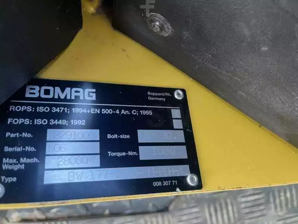 Tämä Bomag-merkin pallo- ja rengastiivistin on BW177 D-4 -malli vuodelta 2006. Pituus: 4 M 85 Leveys: 1,84 m Korkeus: 2,87 m Paino: 6800 kg. Pallon leveys: 1 M 69 Pallon halkaisija: 1 M 23 Rengaskoko: 14,9-24 Tärinätaajuus: 40 Hz Staattinen linjakuorma: 24,9 kg/cm Ajonopeus: 11 km/h 2011 Deutz BF 4M 56 kW (75 hv) moottori 944 tuntia