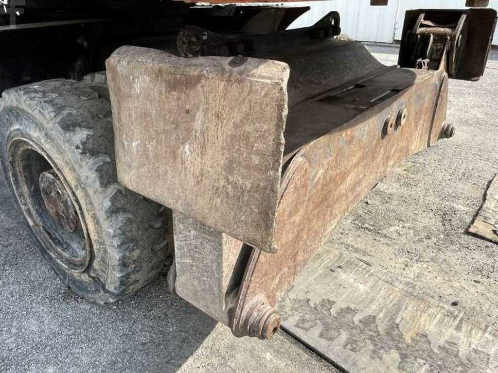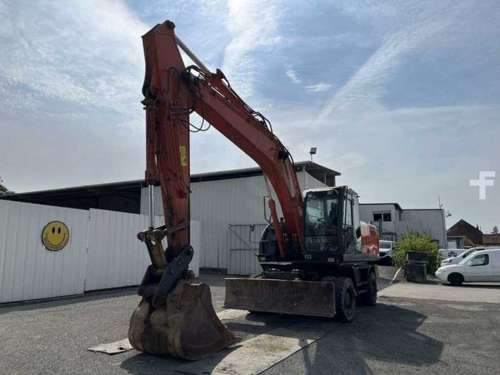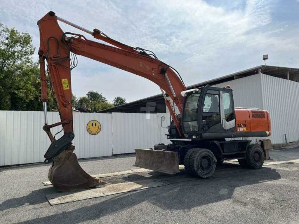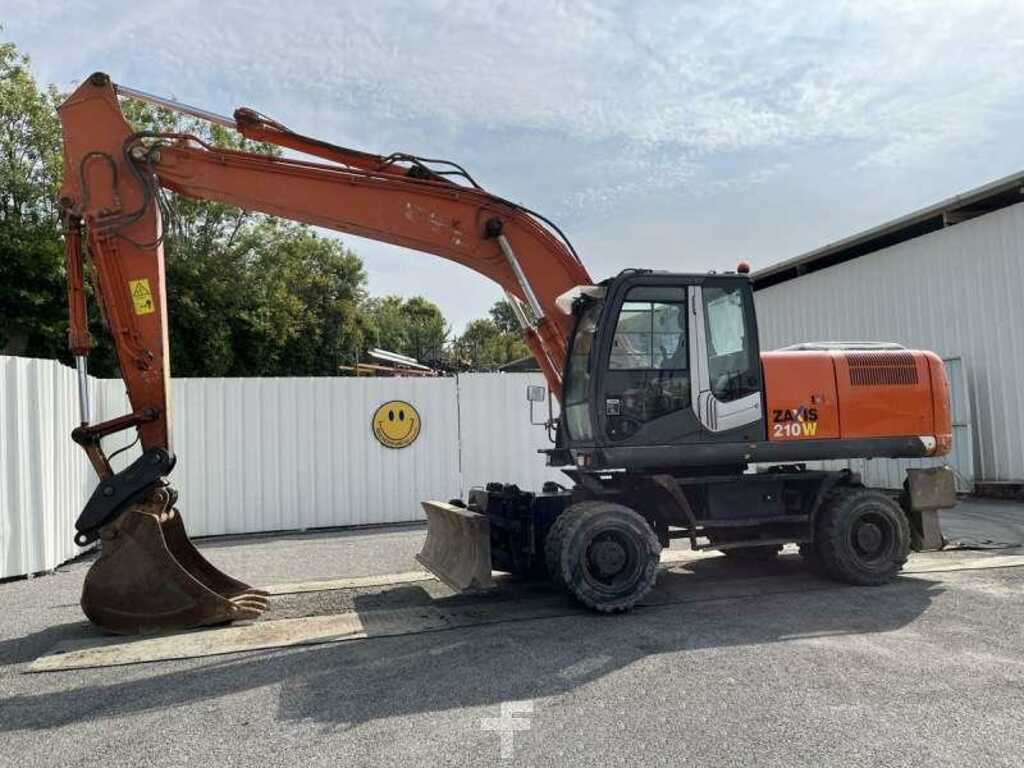 Cette pelle sur chenilles de la marque Hitachi est le modèle ZX210W-3 de 2011.