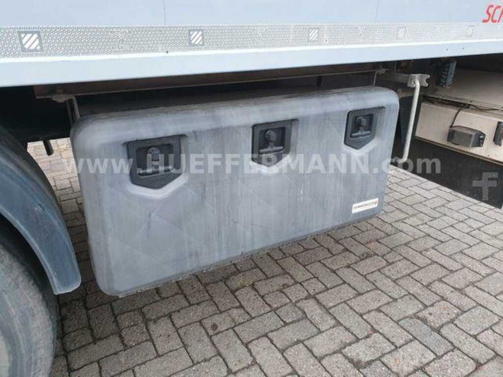 ABS, EBS, RSS, 3x 9 to. (SAF) Achsen, Luftfederung, Scheibenbremsen, verstärkte Achskörper, Offroad-Ausführung; Achslift auf 1. Achse, hebt und senkt automatisch gewichtsabhängig, bei gelifteter Achse erhöht sich die Lade- bzw. Gesamthöhe um ca. 50mm; mechanische Stahl-Abstützwinden 2x12t, Achslastanzeige über EBS-Canbus Signal, hydraulisch verschiebbarer Aluminium Profilboden "Cargo Floor" , Schublänge 200mm, Boden-Profil 10mm glatt , Bedienung per Handyapp , 13 Paar 2t Bodenzurrbügel, Aluminium-Hohlprofil-Trennwand, 3 Stück schwenkbare/abnehmbare Querverbindungsstangen 60mm, Aufteilung von vorne: ca. 4300mm/ca, 4.300mm/ca. 4.300mm, Kunststoffrollplane in verstärkter Ausführung (900g/m²), Aluminium-Doppeltür am Heck , pneumatische Zusatzverriegelung für Hecktüren, Kunststoffstaukasten , geschlossen, 2x7-polige Steckdosen, 1x15-polige Steckdose, 2 LED Arbeitsscheinwerfer, A-Schild