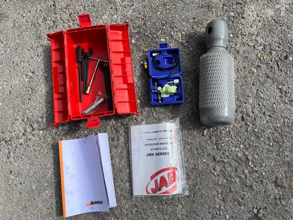 2 Spitzmeissel, Werkzeugbox, Stickstoff-Füllgerät mit Gasflasche Anbauplatte geschraubt, passend zu Schnellwechsler HUM05 Schlauchsatz inkl. Schnell-Kupplungen